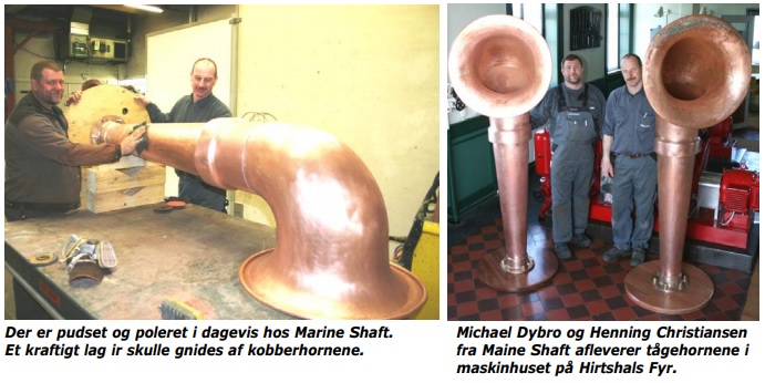 Byens første sæt tågehorn, som var monteret i den første tågesignalstation, der blev oprettet i 1877, kom i 2010 blankpudsede tilbage til maskinhuset ved Hirtshals Fyr.