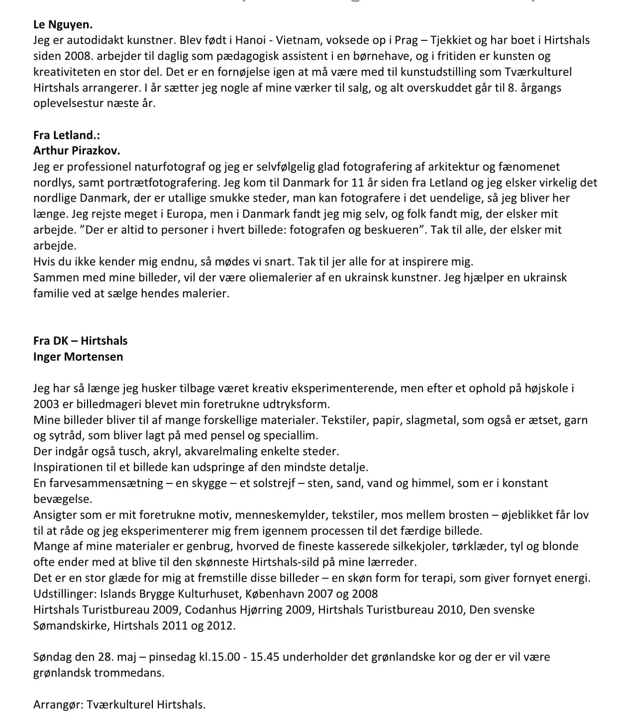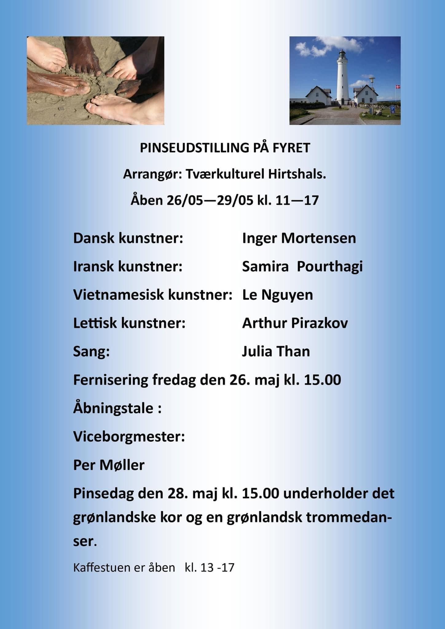 Foreningen Tværkulturel Hirtshals inviterer fredag den 26, maj til mandag den 29. maj til pinseudstilling på Fyret. Alle dage kl. 11 til 17 i Assistenthuset ved Hirtshals Fyr.