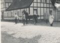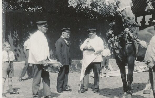 Billedserie: Trommeslageren og den pyntede hest i hhv. Vestergade og på Axeltorv den 27. juni 1933. Billedserien er optaget til Nationalmuseet. Fotos: Kaj Uldahl. Historisk Arkiv/VHM. Personalet foran C. O. Christensens Hesteslagteri, Østergade 52 i Hjørring, 1937. Foto: Historisk Arkiv/VHM.