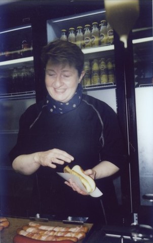 En venlig dame stod ved grillen. Hun vendte pølserne og satte brød over. Hun hed Tina.