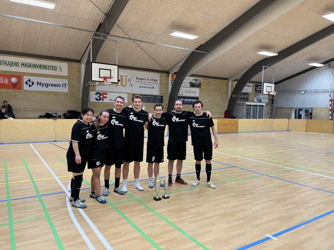Mix 2. division skulle starte ud allerede kl. 8. Der var 10 hold fordelt på 2 puljer og begge 1’ere skulle mødes i finalen. Den kamp blev mellem PostNord og Blæksprutten, hvor posten næsten kunne nå pokalen, indtil de sidste sekunder, hvor Blæksprutten udlignede til 4-4. Tiden blev stoppet og finalen skulle afgøres på første scorede mål. Det blev Blæksprutten, der fik bolden i nettet og kunne løfte den største pokal til lyden af Queen og horn, fortæller Steffen Rævskjær Ledet.