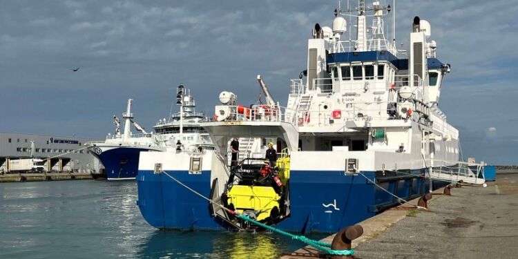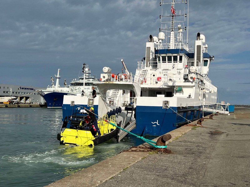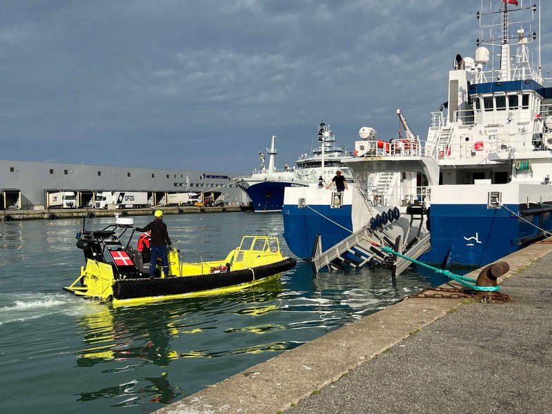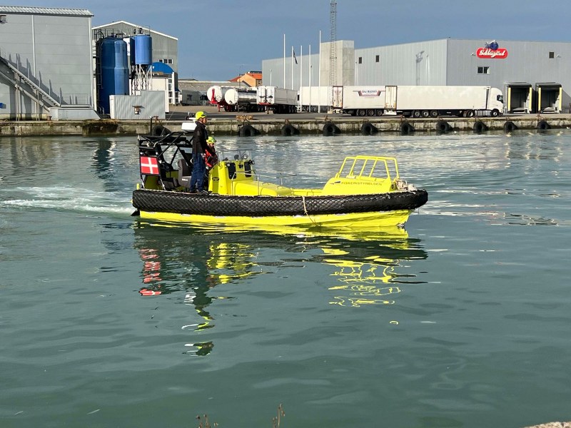 Det sidste kunne man lørdag morgen iagttage i Hirtshals Havn, hvor mandskabet tilsyneladende under en lille øvelse ud for Frysehuskajen ved hjælp af en hydraulisk rampe søsatte det lille fartøj fra agterstavnen af Nordsøen.