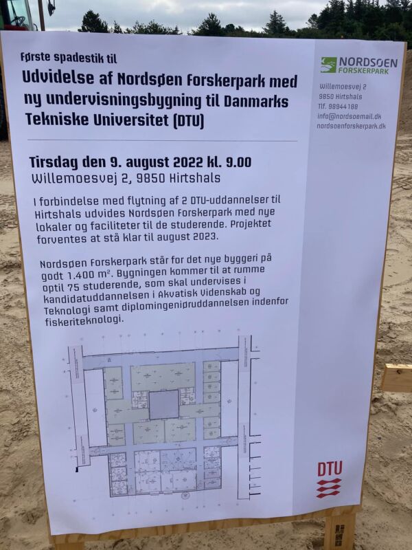 Det er som tidligere omtalt Nordsøen Forskerpark, der står for byggeriet af den nye undervisningsbygning på ikke mindre end 1.414 m², der placeres i umiddelbar sammenhæng med DTU Aquas eksisterende faciliteter, hvor det første spadestik i dag blev taget ved Nordsøen Forskerpark.
