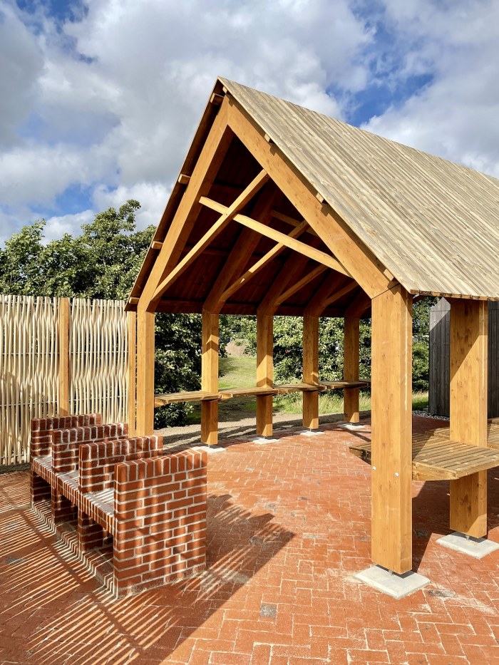 Området indbyder nu både til afslapning og aktiviteter med bålsteder, urtebede og ikke mindst det fantastiske overdækkede udekøkken i træ Her findes arbejdsborde i børnehøjde og plads til at eksperimentere, kokkerere, bage og kværne korn.