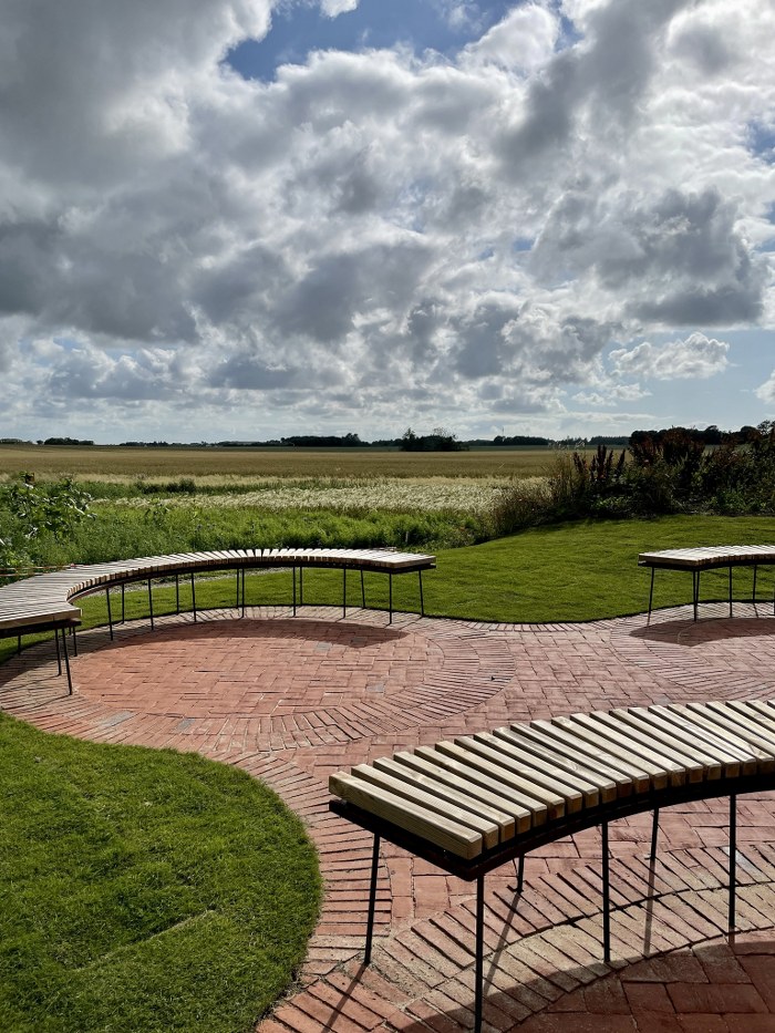 På den nye udendørs aktivitetsplads kan du i første omgang slå dig ned på en bænk og nyde udsigten til de omgivende marker ved Kornets Have og Kornets Hus.