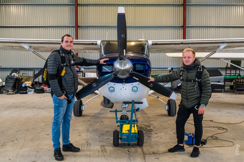To friske faldskærmsudspringere, Anders Skovsgaard Jensen og Mikkel Normann Jensen, står her på billedet ved klubbens nyerhvervede stolthed – en Cessna… De to faldskærmsentusiaster havde i forbindelse med Knæk Cancer planlagt at begå en ny rekord for udspring fra solopgang til solnedgang midt i september, men desværre måtte forsøget aflyses på grund af lidt for livligt vejr… Helt forgæves var det ikke, da der vist blev samlet penge ind til det gode formål alligevel…