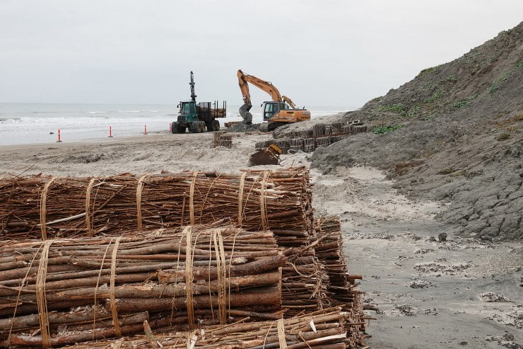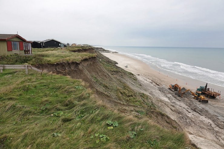 På det første af billederne nedenfor, som er fra februar, er der allerede lagt meget sand til langt op ad skrænten, hvor det ellers så umuligt ud at redde husene ovenfor.