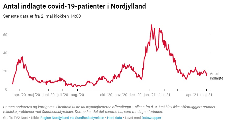 Der er i øjeblikket 179 indlagte på landsplan. Det er fem flere end i opgørelsen lørdag, men det er stabilt og på ingen måde et højt tal i forhold til sunhedsvæsenets kapacitet. Her i Nordjylland er der i øjeblikket 18 indlagte og det er, som på landsplan, med til at tegne et billede med stabile nøgletal.