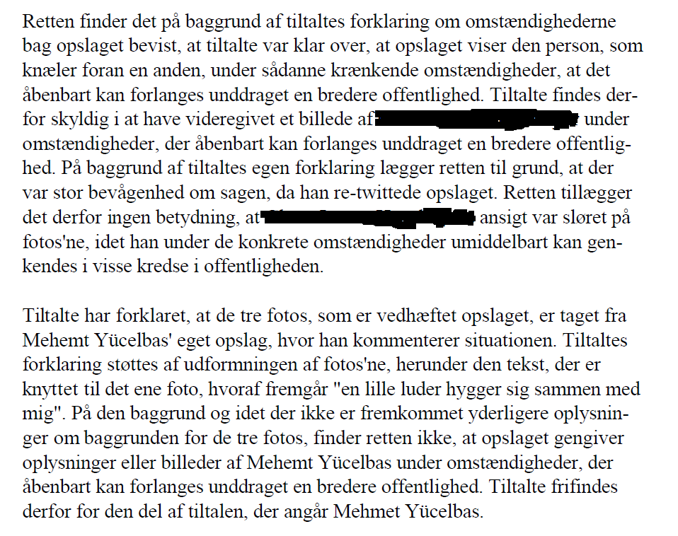 Af dommen fremgår, at de slørede billeder trods uigenkendeligheden krænker ofret, fordi folk i lokalområdet i Sønderborg alligevel godt kan vide, hvem han er. Dette har imidlertid intet med mit retweet at gøre. Dommer Fuglsangs påstand er så ekstremistisk, at end ikke anklageren under retsmødet prøvede at argumentere i den retning.
