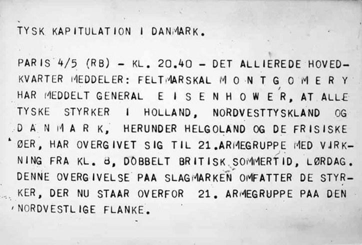 I dette øjeblik meddeles det, at Montgomery har oplyst, at de tyske tropper i Holland, Nordvesttyskland og i Danmark har overgivet sig.