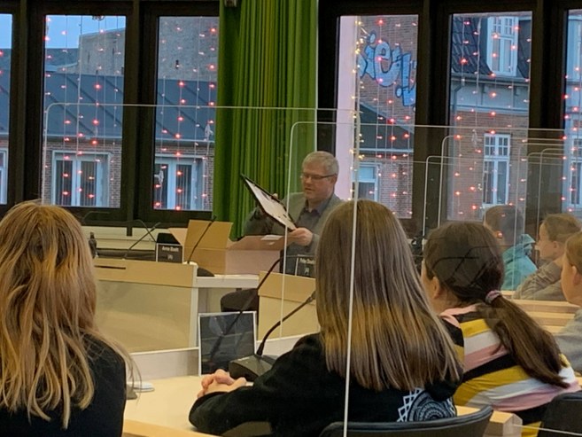 Arne Boelt fortalte om sin opvækst og vejen til borgmesterkæden. Han kom desuden lidt ind på sin kontakt til statsministeren i forbindelse med coronasituationen. Derefter var der spørgsmål fra børnene.