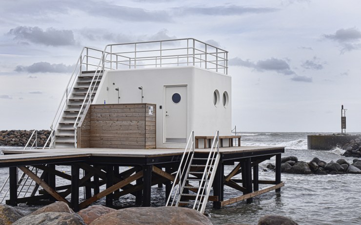 Udsigten fra saunaen er helt unik, da saunaen står så tæt på kanten af platformen. Som med bygningens eksteriør, der leder tankerne hen på et skib, føles det, når man sidder i saunaen, at man er ombord på et skib, da der kun er udsigt til vand.