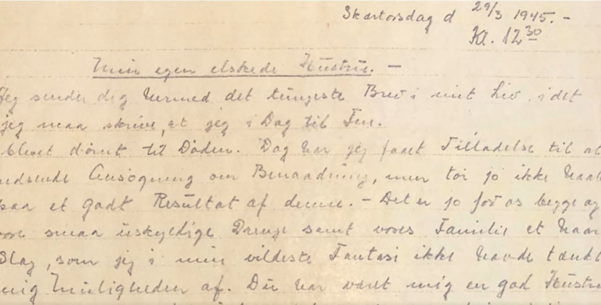 Min egen elskede hustru. Jeg sender jeg det tungeste brev i mit liv, idet jeg til formiddag er blevet dømt til døden.