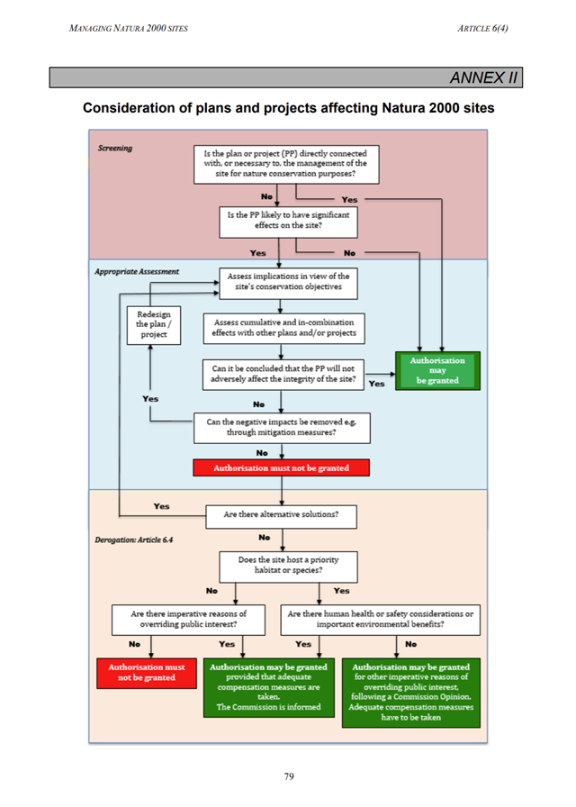 Hvis man ser på nedenstående model, som EU har udarbejdet til brug for de nationale myndigheder, så fremgår det, at et projekt, som fx en udvidelse af Hirtshals Havn umiddelbart ikke kan tillades, såfremt det vil have en signifikant effekt på Natura 2000 området. Men hey – er en udvidelse der vil berøre 0,016 procent af Natura 2000 området en signifikant effekt? Næppe.