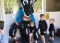 Gruppefoto med Ulven Billie og spillerne, som havde fået deres nye fine træningsdragter på.