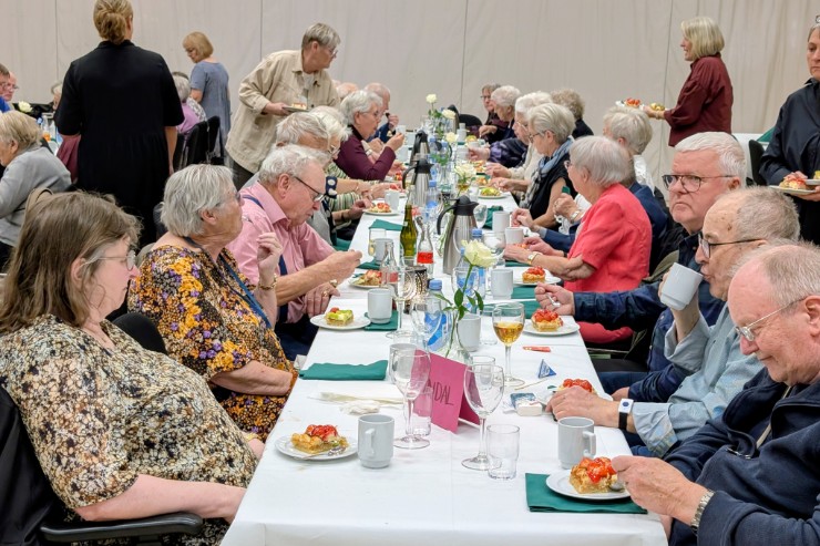 Der blev danset uafbrudt i en hel time, før gæsterne kunne puste ud med kaffe og lækker frugttærte. Men pausen var kort. Så snart kaffen var drukket, blev der igen budt op til dans, og de mange fremmødte nød at synge med på de kendte sange.