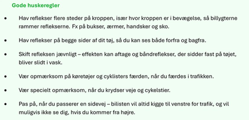 ”Mange forældre er gode til at sørge for, at deres børn har reflekser på overtøjet, og det er vigtigt. Men reflekser er ikke kun for børn. Børn færdes sjældnere i trafikken efter mørkets frembrud end de voksne, og derfor er det vigtigt, at voksne går foran som gode eksempler for de yngste og husker reflekserne,” forklarer hun.