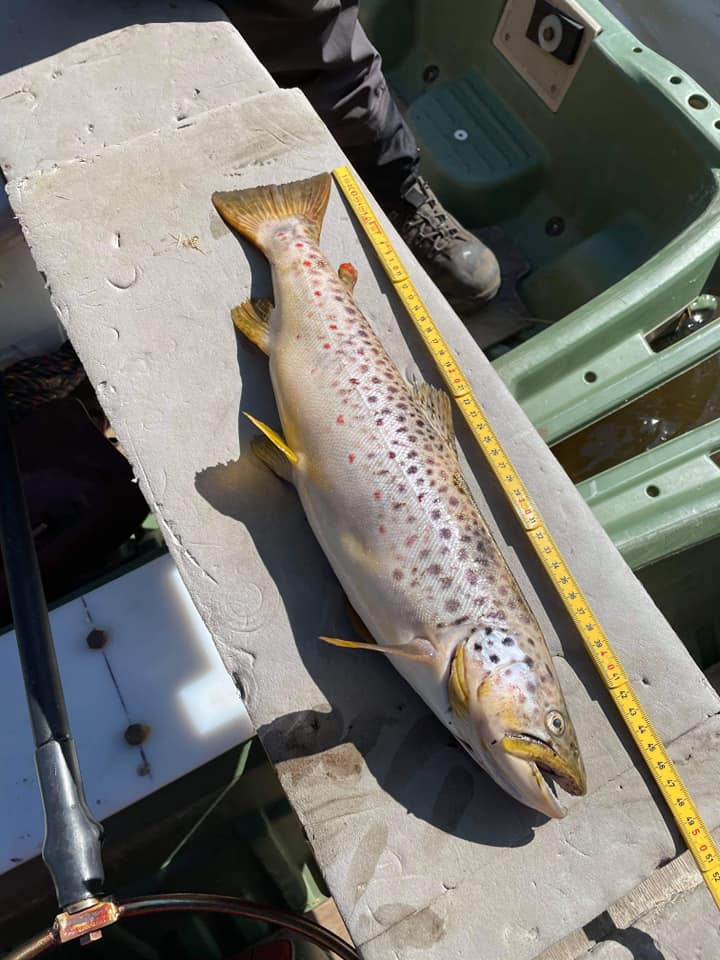 Desværre blev de noget slukørede, da de sejlede længere ned af åen. Der var døde fisk, de få steder, hvor vandet var lavt, men de kunne slet ikke se bunden på næsten hele strækningen, da åen jo er noget større og meget dybere dernede. Elfiskerne registrerede 32 døde ørreder og elfiskede lidt smolt, der stod lidt sporadisk hist og her på de 5,3 km. vi elfiskede.
