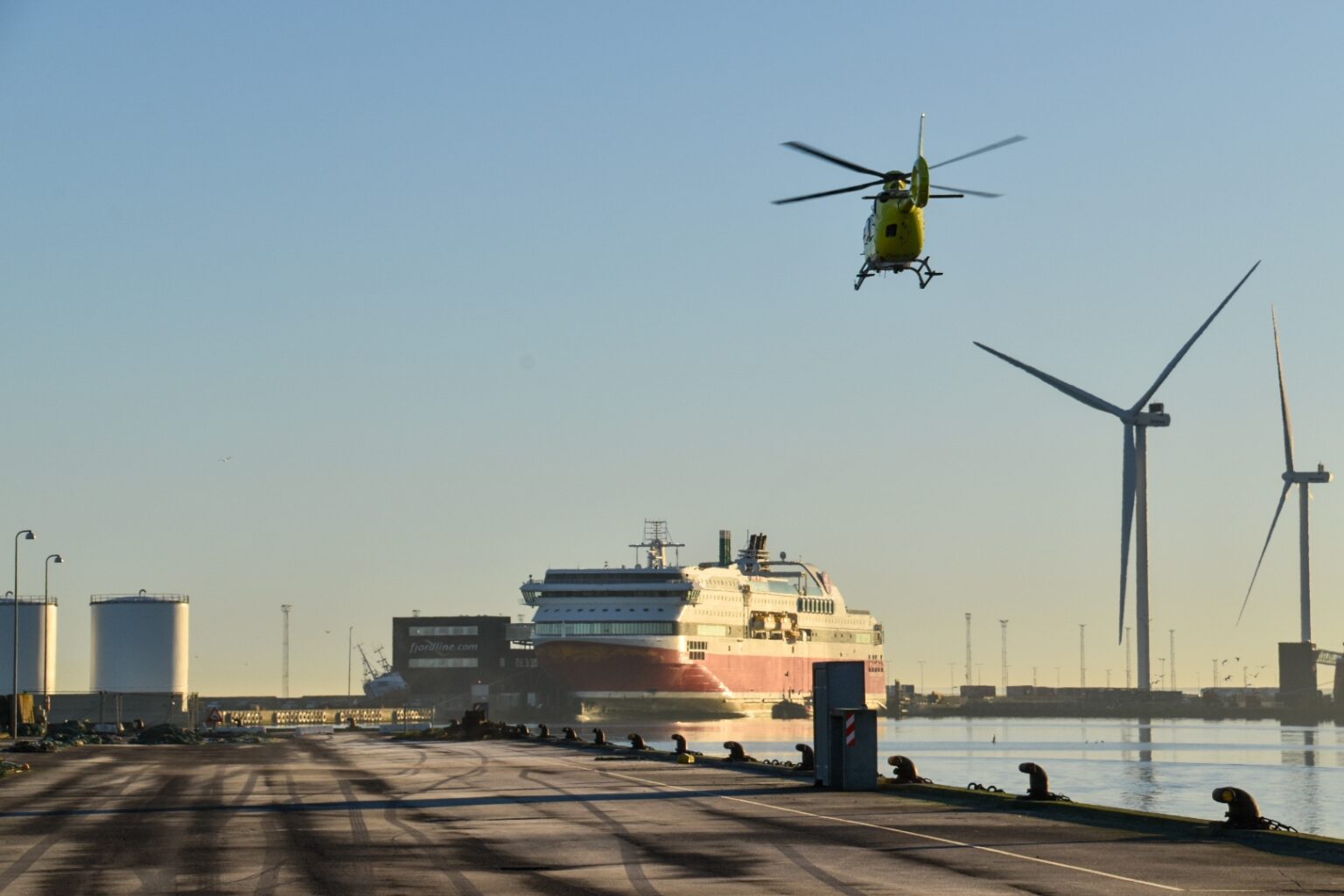 Redningsmandskab rykkede tirsdag formiddag ud til havnen. Lægehelikopteren landede og en person blev taget med.
