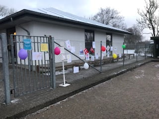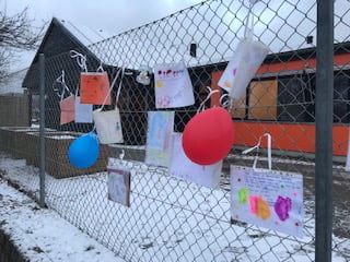Flag, balloner, tegninger og breve med varme, søde og rørende hilsner fra børn og forældre til personalet med tak for deres indsats i hverdagen især under coronakrisen.