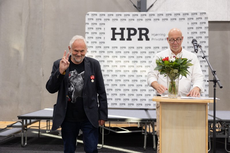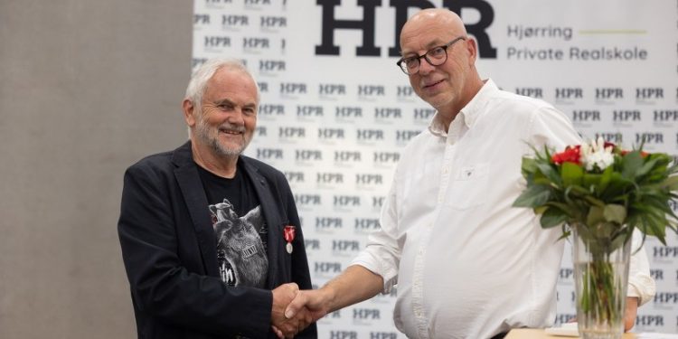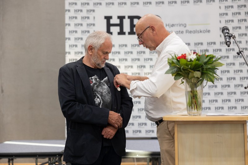 Efter over 40 års tro tjeneste på skolen kunne den vellidte lærer nemlig gå på velfortjent pension, og i den forbindelse blev hans store indsats hyldet med overrækkelsen af Den Kongelige Fortjenstmedalje til kæmpestore klapsalver fra de mange fremmødte i HPR-Hallen i Femhøje Idrætscenter i Hjørring.