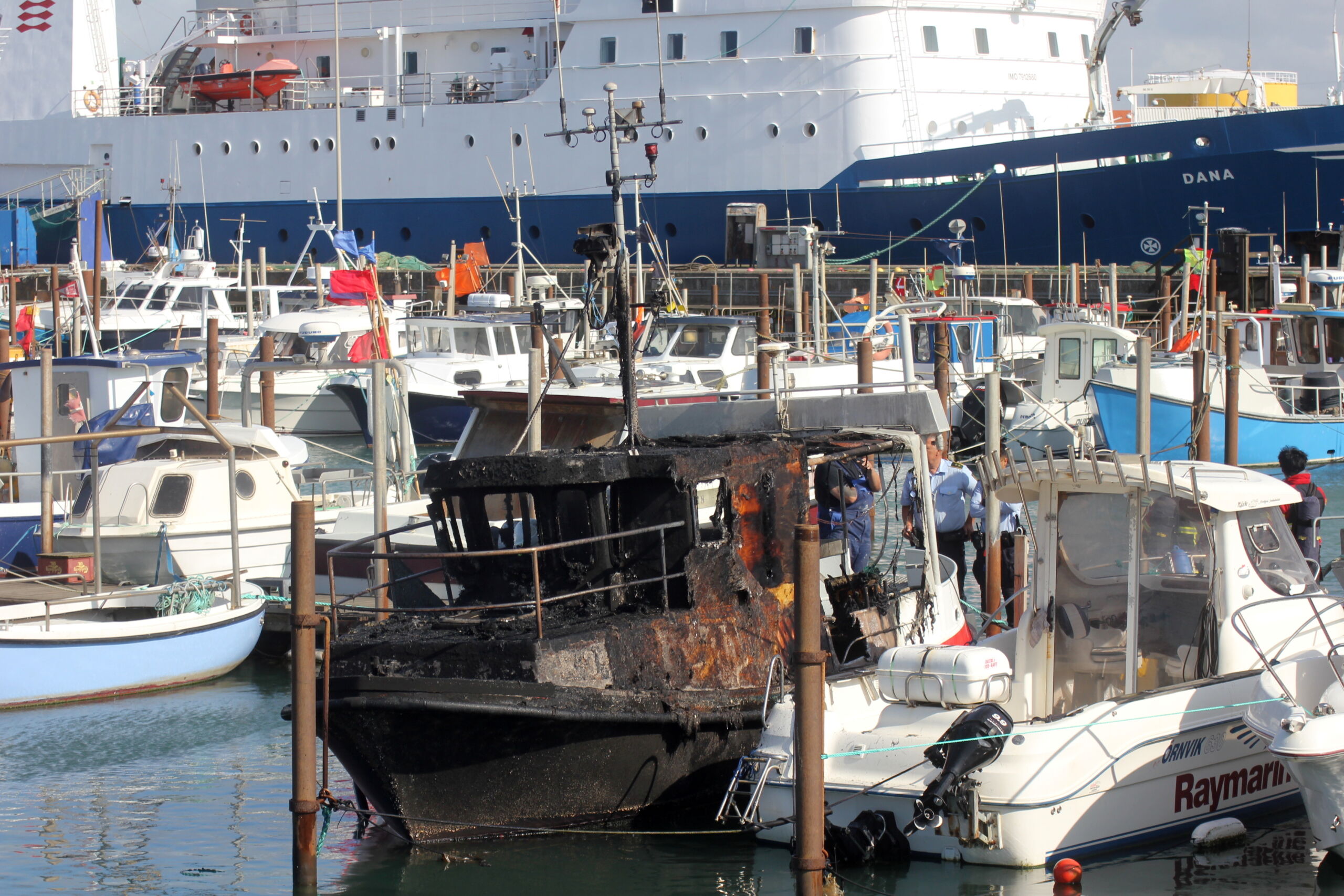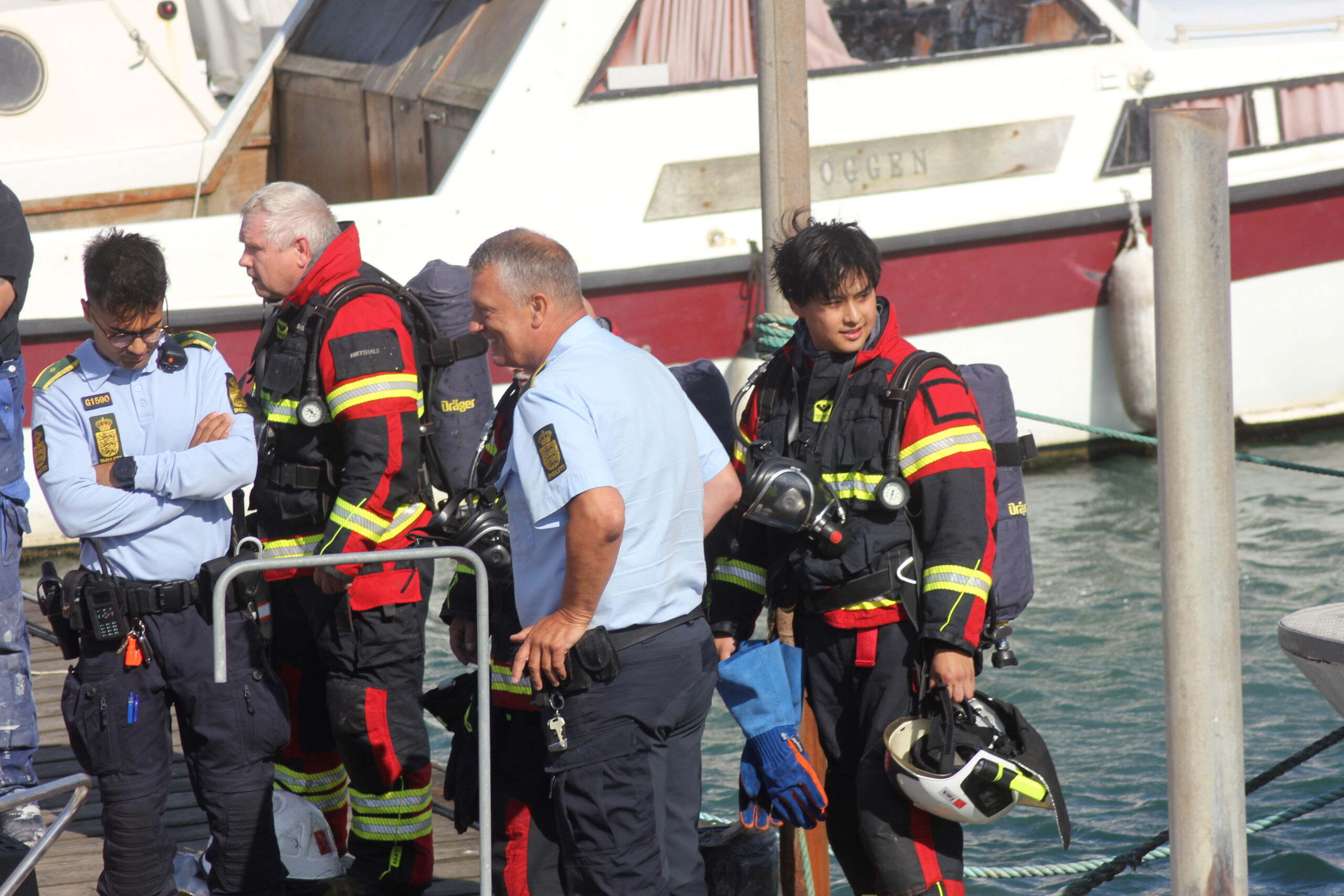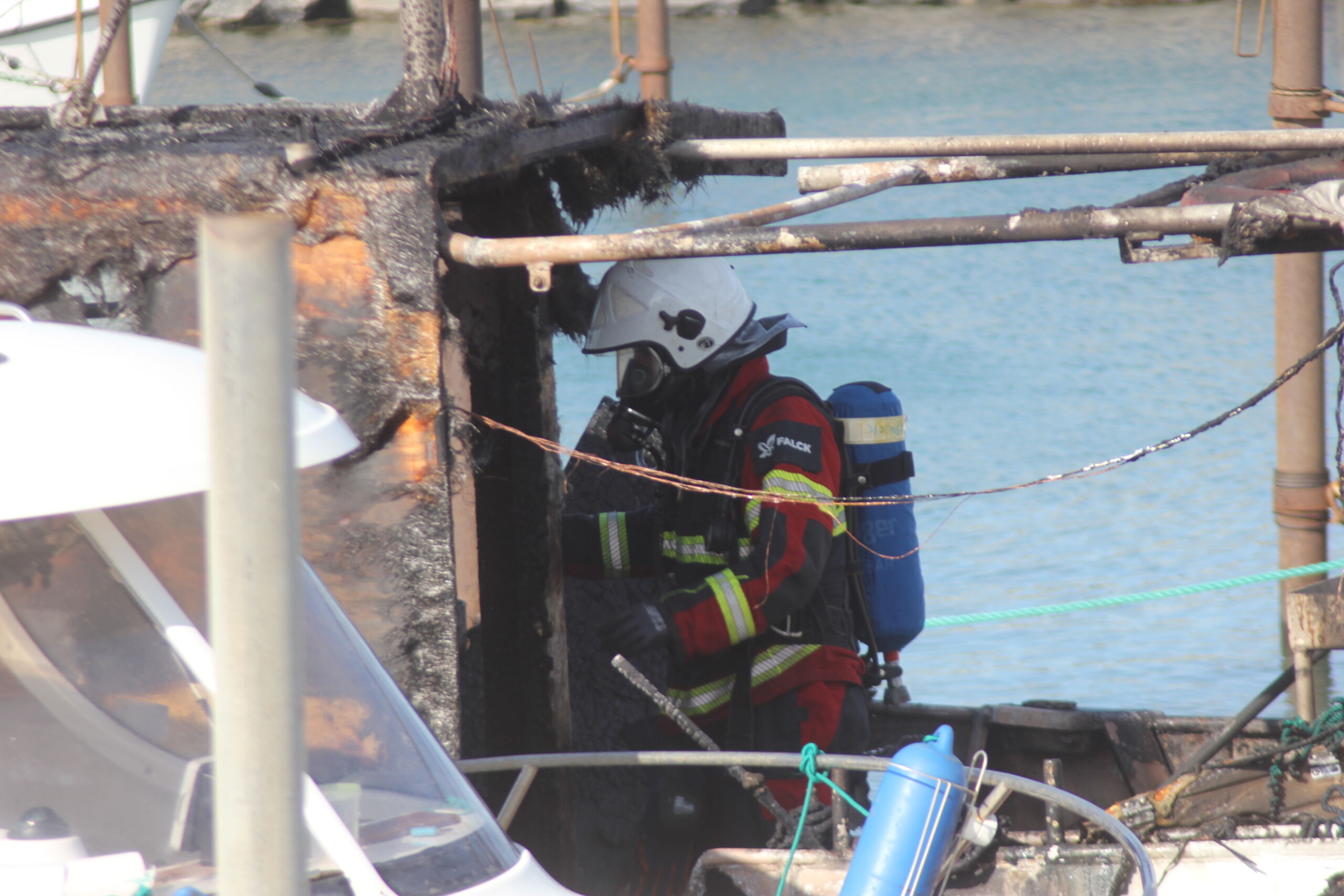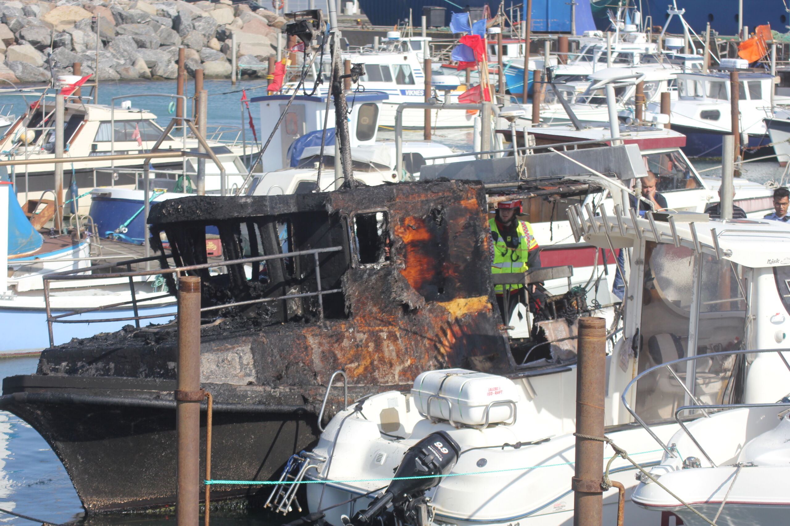 – Båden lå og bankede ind i nabo skibet, som også har fået brandskader. Vi ville egentlig gerne have en båd ud og hjælpe med fortøjningerne, men grundet vind og vejr kunne det ikke lade sig gøre, erkender Jørgen W. Pedersen, der dog sender rosende ord mod de mange hjælpende.
