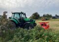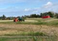 Øst for Tversted arbejder Bæks Maskinstation ved Mikkel Bæk Kristensen fra Bjergby med at slå græs på fælles-arealer. Det er blandt andet det omfattende stisystem, der forbinder hele området, og ved denne sø, som i forrige vinter var fyldt med vand koldt nok til at kunne bære skøjteløbere.
