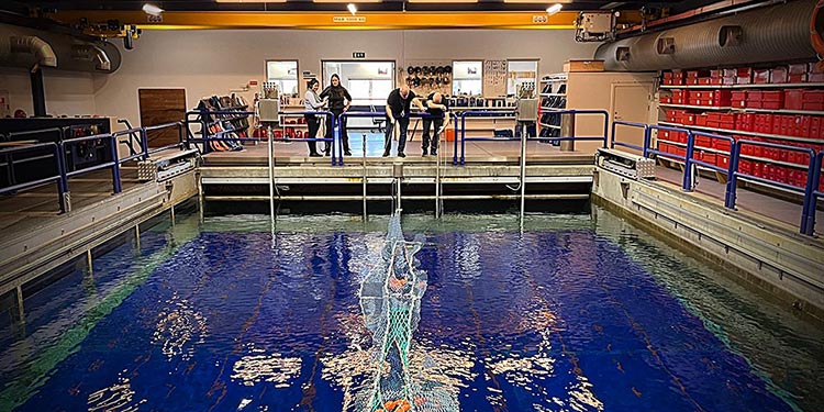 I prøvetanken hos SINTEF blev en fuldskala-fangstpose rullet ud i vandet og beskuet igennem det enorme observationsvindue. BBC-journalisten optog lyde af redskabet, der blev sat ud i prøvetanken, og Junita Karlsen fortalte journalisten om, hvordan LED-lys har været testet i trawl og kan kombineres med mekaniske selektionsanordninger for at forbedre torskens muligheder for at undslippe redskabet.