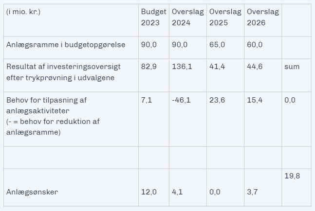 - At udvalgenes trykprøvede investeringsoversigt og anlægsønsker bliver håndteret i forhold til den vedtagne anlægsramme.