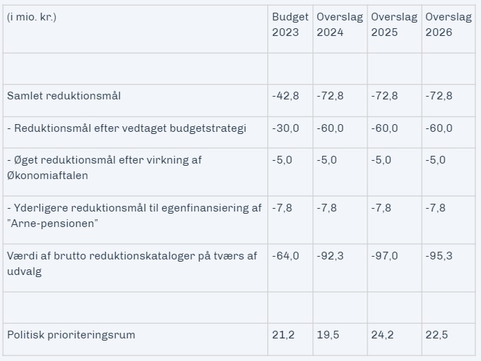 Nedenstående tabel viser det samlede reduktionsmål, den beløbsmæssige værdi af reduktionskataloget og det politiske prioriteringsrum.