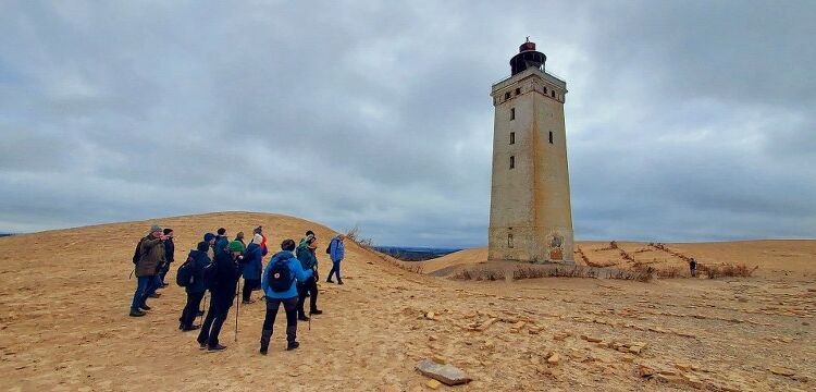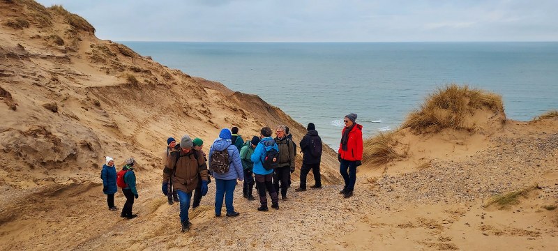– Sikke da en dejlig tur vi havde over klitterne ved Rubjerg Knude. Det holdt tørt, der var ikke meget vind og solen fandt endda også vej til os. Den store sandkasse var våd, så der var ikke den mindste chance for sandfygning, som vi så ofte har oplevet. Vi gik selvfølgelig ad velkendte stier, men det var da også lykkedes mig at finde lidt nyt at krydre turen med, fortæller arrangøren Birthe Nesgaard Johansen.
