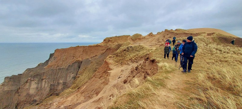 – Alt forandrer sig derude, intet er som sidste gang, man gik der. Der var godt nok heller ikke meget parkeringsplads tilbage ved Mårup Kirketomt. Det er skræmmende men samtidigt meget betagende, at landskabet derude forandrer sig så hurtigt. Snakken gik livligt i flokken, som i dag bevægede sig meget tæt på kanten med stor forsigtighed, uddyber arrangøren bag de mange fantastiske vandreture i det nordvestlige Vendsyssel.