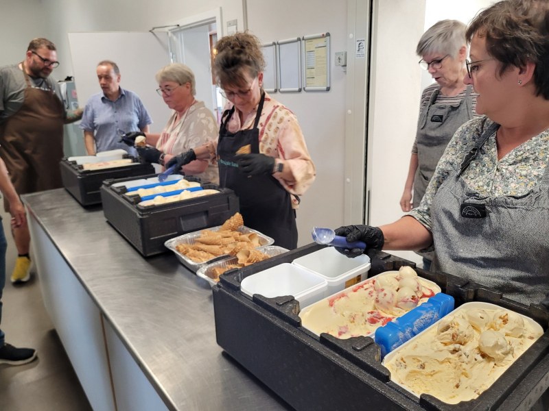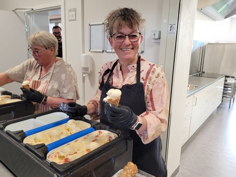 Dagens overraskelse var en vaffel med kugleis af nougat og en anden af jordbær. Formanden for BHE, Klaus Kold, præsenterede Rie fra det nye lokale Hebbelstrup Gaard Is. Hun informerede lidt om produktionen og de råvarer, der bliver anvendt i isene.