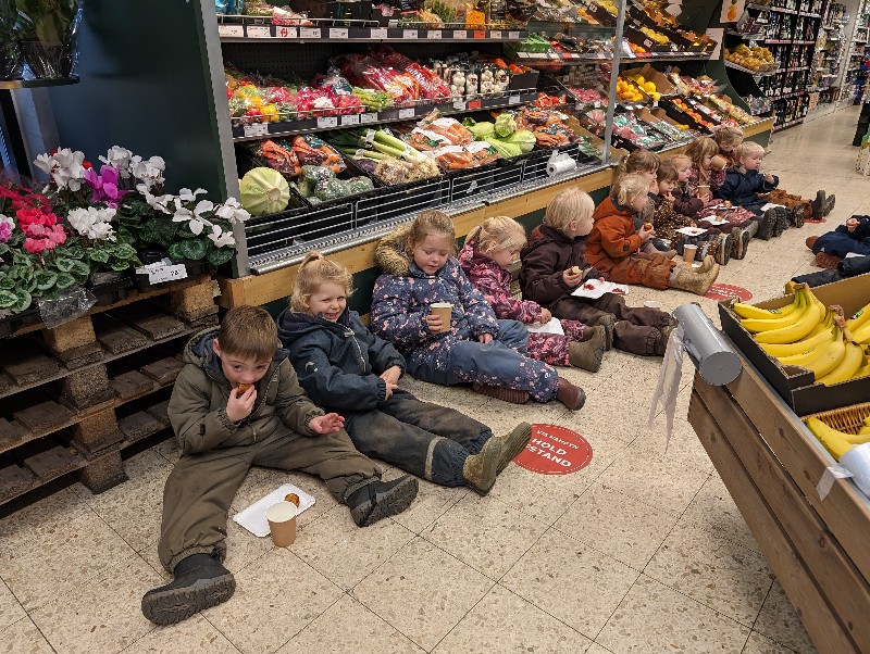 Anført af Børnehusets pædagoger ankom 14 børn i alderen 3 – 5 år tidligt om formiddagen til Brugsen. De medbragte selv julepynten til træet. Børnene havde nemlig i sidste uge hygget sig med at klippe og klistre i børnehaven, og de glædede sig til at få lov til at hænge julepynten på træet.
