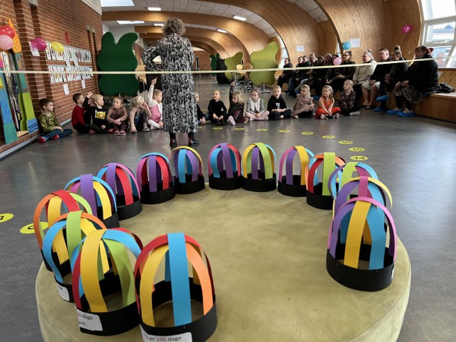 Derefter gik festen ellers i gang for fuld skrue med deltagelse af stolte forældre, der fik flødeboller samt saft, mens de kunne se en udstilling af lige præcis 100 ting, som børnene i dagens anledning havde haft med i skole.