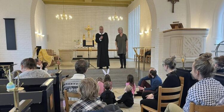 Onsdag hørte de fremmødte store og små om påsken, især skærtorsdag, hvor Jesus lærte os at mindes ham, når vi deler brød og vin i kirken – så derfor dækkede de smukt påskebord. Man kunne også komme med op til alteret og få brød og vin, det der kaldes nadver. Og så skulle man selvfølgelig som altid både synge og danse – og DET gav genlyd i Hirtshals Kirke.