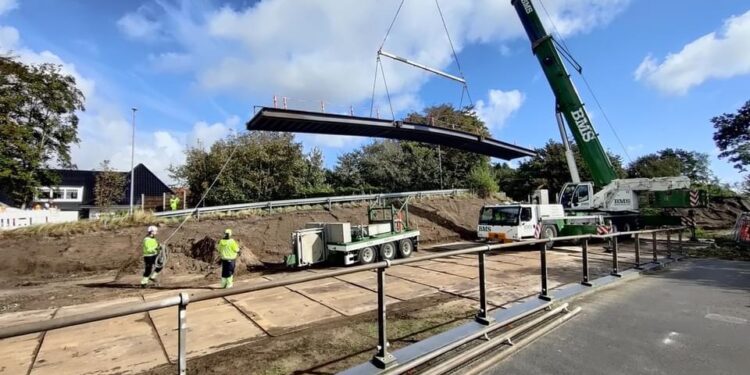 Den nye bro er lavet i 46 betonelementer, hvoraf de tungeste elementer vejer over 33 ton pr. stk. Det har krævet noget stort grej, og i torsdags havde vi besøg af en 750 ton mobilkran til at hejse de sidste elementer på plads.