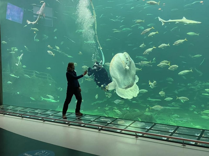 Her fik de en tur backstage med akvarieassistent og dykker Henrik Brink. Han tog dem helt op til vandoverfladen i den store tank. Her fortalte han en masse spændende og lærerige ting og enkelte røverhistorier også.