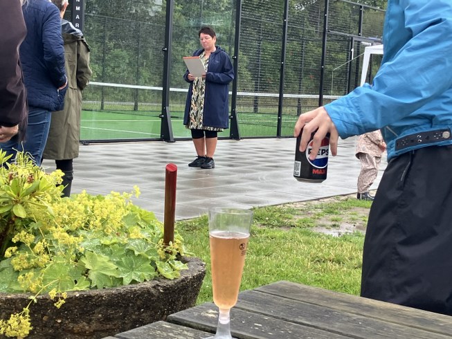 Regnen forsinkede indvielsen lidt, før styregruppeformand og formand for BTI Tennis, Jette Pedersen, kunne byde velkommen ved de nye baner tæt ved de flotte tennisbaner.