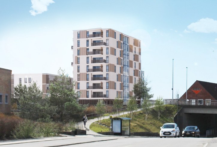 Det nye højhus midt i Hjørring får som naboer to mindre boligblokke, der bygges ovenpå eksisterende forretninger.