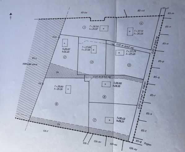 Den omdiskuterede matrikel ses på tegningen her nederst til venstre. Som kritikerne ser tegningen, ligger byggeriet ca. 8 meter forskudt i forhold til den afsatte byggeplads (byggefeltet).