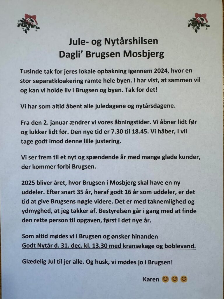 Julefreden har lagt sig over Vendsyssel, men i Mosbjerg er der opstået en mild panik. I sin jule- og nytårshilsen til kunderne afslører den elskede uddeler Karen Pedersen, at hun trækker sig tilbage efter 35 års tro tjeneste, heraf de sidste 16 år som uddeler. Nyheden kommer som et chok for lokalsamfundet, der har vænnet sig til Karens utrættelige energi og engagement.
