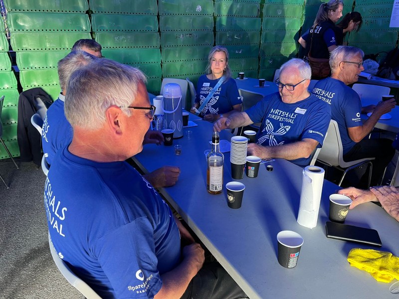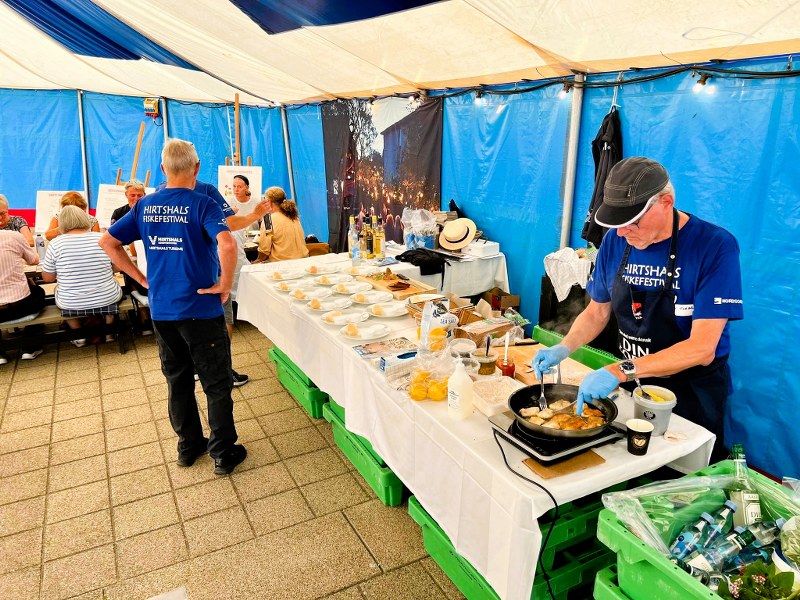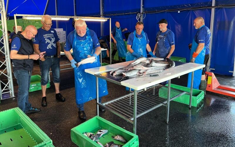 Veloplagt var også den tidligere havnedirektør Jens Kirketerp Jensen, som hvert år trofast vender tilbage for at være frivillig ved Hirtshals Fiskefestival. Her kunne man blandt andet opleve ham som garvet guide på havnerundfarter med HG 159 Johs. Hejlesen. Fornuftigvis har han og de andre frivillige tid til pauser, hvor de serviceres eksemplarisk bag kulisserne af grønne fiskekasser.