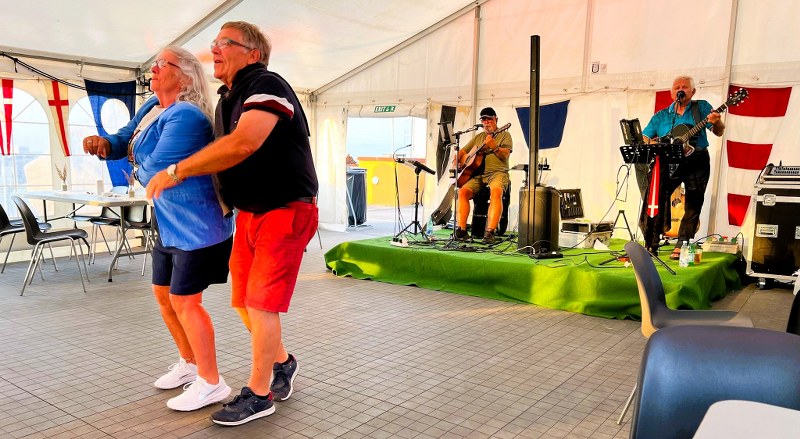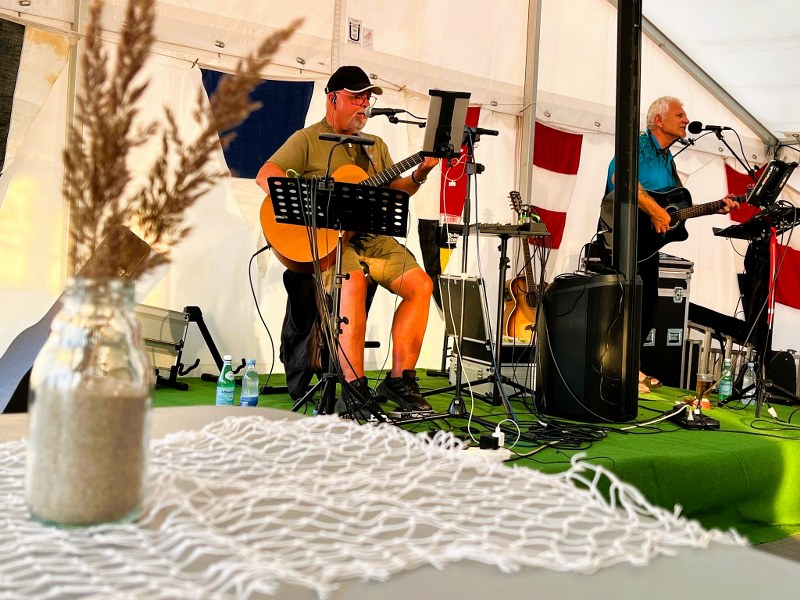 Efter en fantastisk fredag med masser af aktiviteter til Hirtshals Fiskefestival blev aftenen rundet af med fiskebuffeter i teltene både under og over Trappen, mens Chris og Per som altid veloplagt spillede i teltet hos Marineforeningen foran Hirtshals Kro & Restaurant.