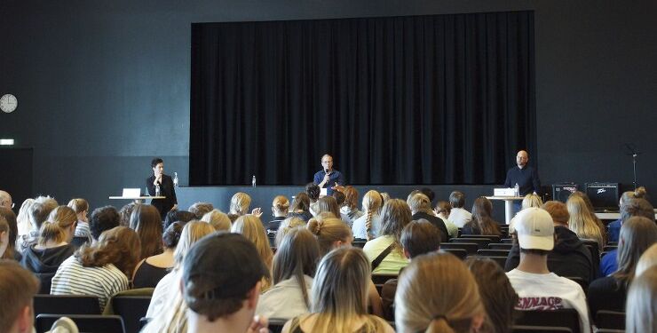 Her var de tre folketingspolitikere Anne Honoré Østergaard (V), Rasmus Prehn (S) og Peder Hvelplund (EÆ) mødt op for debattere forbeholdet, som mange af de unge skal tage stilling til i stemmeboksen d.1. juni