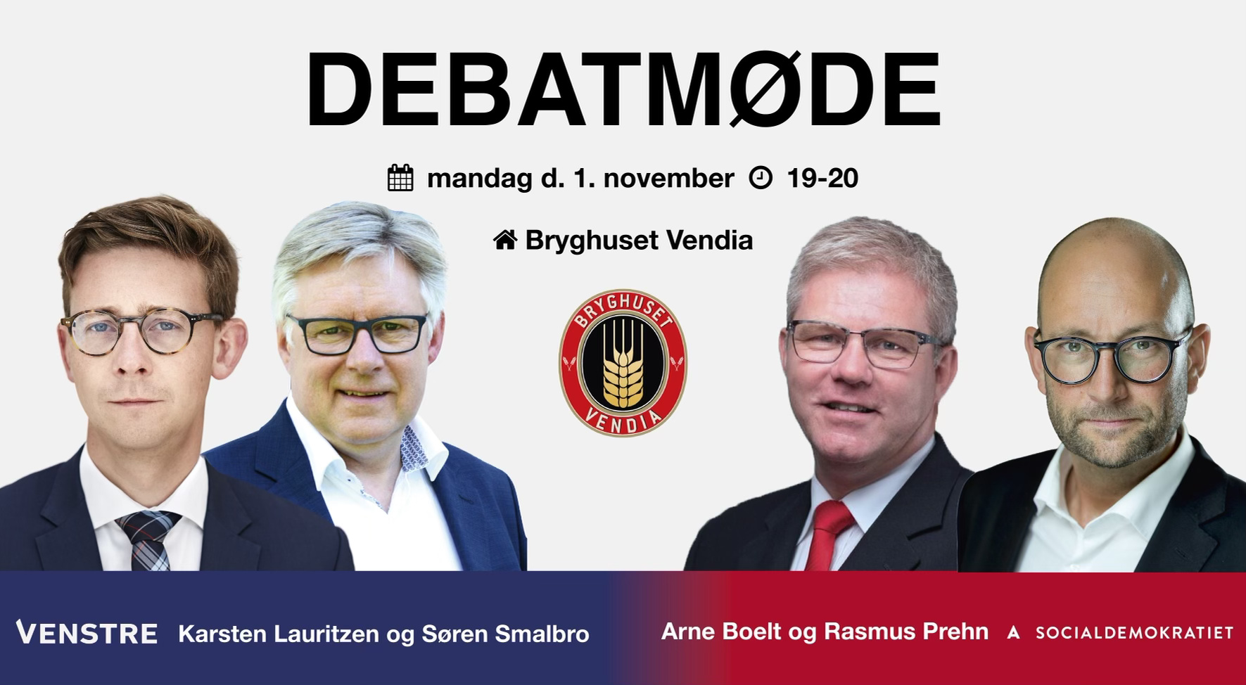 Det politiske debatmøde bliver med spidskandidaterne Søren Smalbro (V) og borgmester Arne Boelt (S), som begge vil være stærkt flankeret af henholdsvis Venstres gruppeformand og tidligere skatteminister Karsten Lauritzen og den nuværende socialdemokratiske fødevareminister Rasmus Prehn.