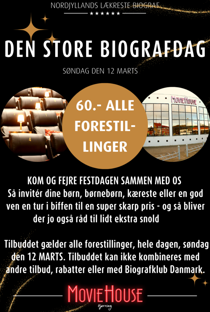 Sirektør Benny Bruun og hans ansatte inviterer til den helt store biografdag, hvor billet til alle film søndag koster 60 kroner i MovieHouse.