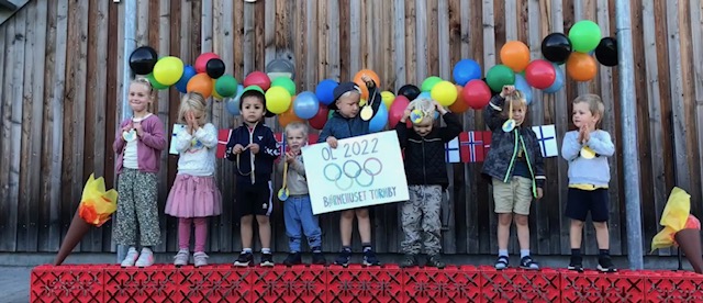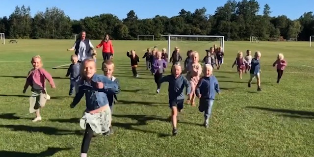 Glade børn fra Tornby Børnehus på sportspladsen.