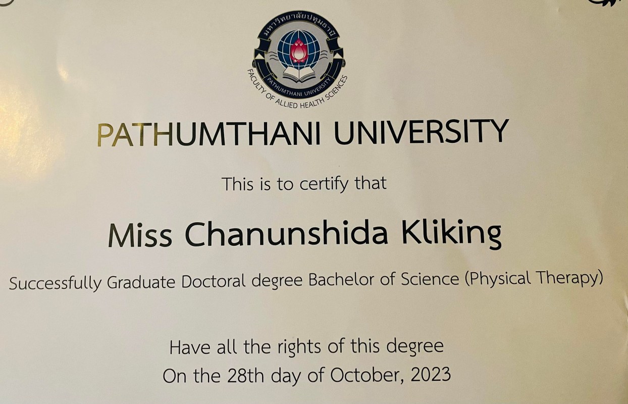 Ang har i 5 år studeret fysioterapi både online og til stede ved Pathum Thani Universitet i Thailand. Samtidig med sit studie har Ang, som det vil være mange bekendt, drevet sin specialklinik for fysiurgisk thaimassage først i Horne og nu på Kystvejen i Hirtshals.