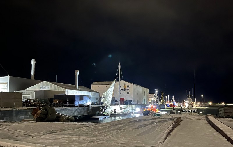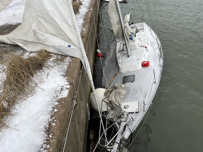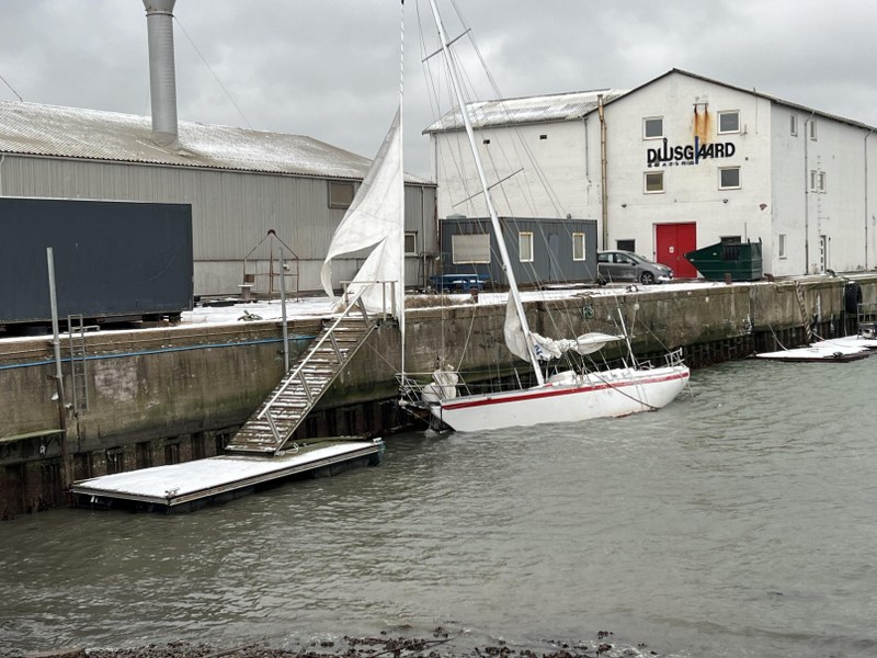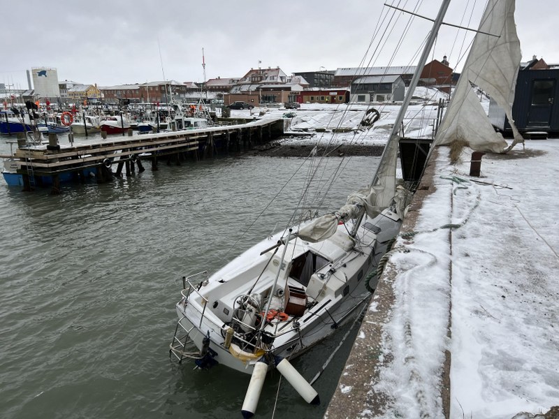 Hvad de nærmere omstændigheder er, vides desværre ikke i skrivende stund, men lørdag morgen ligger sejlbåden og krænger med iturevet sejl ved kajen.